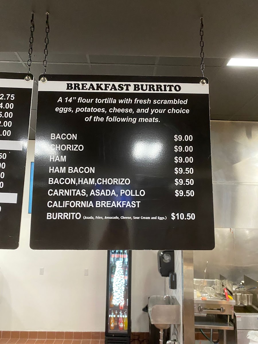 Large flour tortillas, refried beans, rice, your choice of meat, onions, cilantro and salsa.