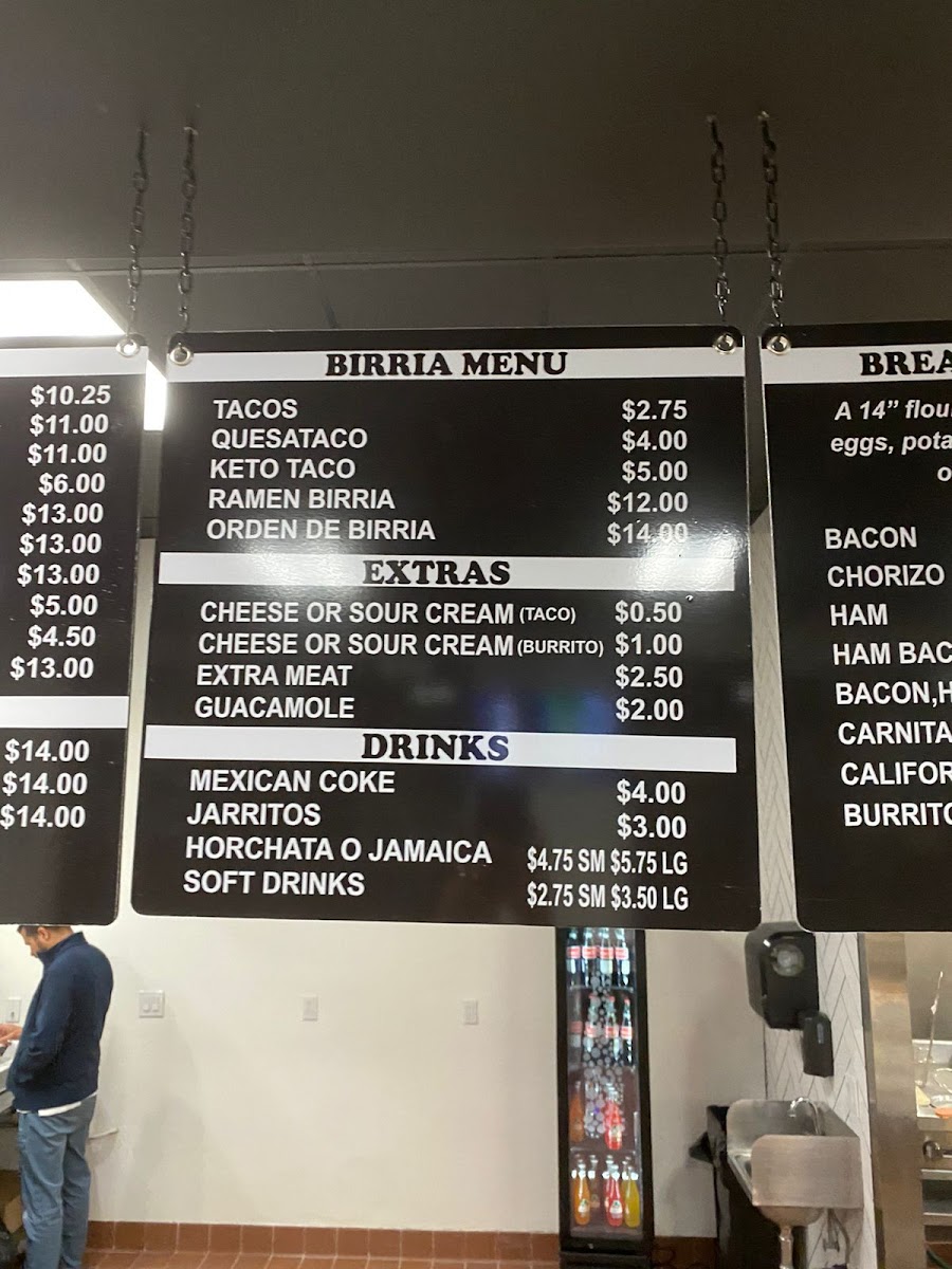Regular size corn tortilla, melted cheese, tender birria, onions, cilantro and salsa. Served with a side of consome (birria sauce) to deep your tacos.